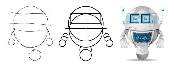 Idea: la propuesta gráfica conlleva la generación de un personaje que acompañe a los niños en la ejecución y aprendizaje de actividades lúdicas basadas en el contexto diario; la anatomía propuesta se basa en una estructura base de esferas que conectan con el cuerpo y permiten una dinámica fluida (Fig. 1, a la izquierda); se busca también un eje central y proporciones para dar peso visual al cuerpo y cabeza (Fig. 1, centro); el paso a la propuesta final llega con la colorización en tonos grises y el manejo de detalles alusivos a la tecnología (Fig. 1, derecha).