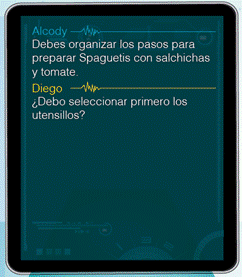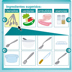 Las actividades lúdicas conjugan iconos e imágenes que deben ser arrastrados desde la zona modular inferior, hasta la zona de actividades, a fin de emular un proceso en una actividad cotidiana. Los utencillos e ingredientes se presentan en un carrusel o galería de elementos de forma dinámica y accesible (Fig. 8).