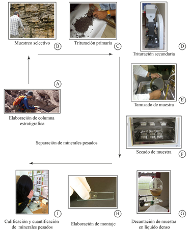 La metodología de separación de minerales pesados utilizada en el presente estudio incluye las siguientes etapas: 1) elaboración de columnas estratigráficas, 2) muestreo selectivo, 3) trituración primaria, 4) trituración secundaria, 5) tamizado de muestra, 6) secado de muestra, 7) decantación de muestra en líquidos densos, 8) elaboración de montaje de minerales pesados y 9) cualificación y cuantificación de minerales pesados.