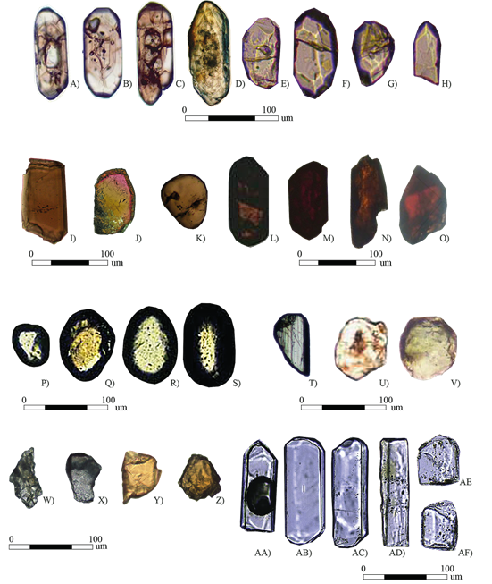 Figura 2. Lámina de minerales pesados 1. A-D. Circones euhedrales; E-H. Circones subredondeados; I. Turmalina euhedral; J. Turmalina subhedral; K. Turmalina redondeada; L. Rutilo euhedral; M-N. Rutilo subhedral; O. Rutilo redondeado; P-Q. Monacita subredondeada; R-S. Monacita redondeada; T. Anatasa subhedral; U-V. Anatasa redondeada; W. Titanita euhedral; X-Y. Titanita subhedral; AB. Titanita redondeada; AC-AD. Apatito euhedral; AE-AF. Apatito subhedral; AG-AH. Apatito redondeado.