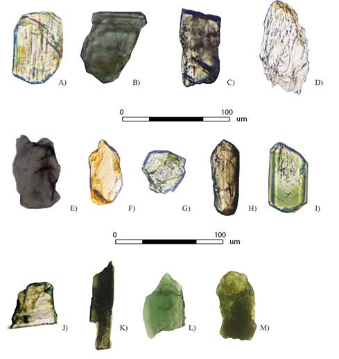 Figura 3. Lámina de minerales pesados 2. A-B. Diópsido subhedral. C. Enstatita euhedral; D. Enstatita redondeado; E-G. Hiperstena subhedral; H-I. Augita subhedral; J-K. Actinolita subhedral; L-M. Hornblenda subhedral.