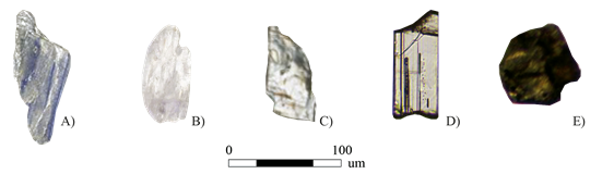 La cianita pertenece al sistema cristalino triclínico, biaxial. El hábito de la cianita es tabular, sin embargo, los granos detríticos de cianita se presentan en fragmentos y escamas irregulares de baja esfericidad. Los granos son predominantemente incoloros o rara vez azules, a menudo con una distribución de color desigual. Presentan alto relieve, birrefringencia media, colores de interferencia amarillos de primer orden y elongación positiva (Figura 4A-4B).