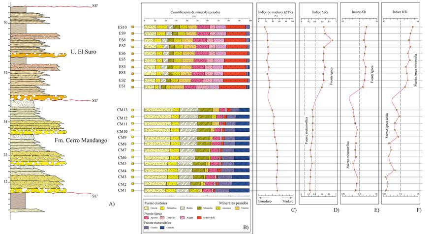 La Unidad El Suro presenta minerales pesados dominados por hornblenda, augita, diópsido y apatito, las cuales indican predominio de rocas ígneas en la fuente detrítica, mientras que bajas concentraciones de minerales como el circón, turmalina, rutilo, titanita y monacita indican una tenue influencia de fuentes cratónicas. Las concentraciones de minerales de origen metamórfico son despreciables (Figura 5B). El índice de madurez ZTR sugiere que el set de rocas analizadas presentas características inmaduras (Figura 5C). El índice Mzi es superior a 0.4 sugiriendo que rocas ígneas dominaron la fuente detrítica (Figura 5D), lo que es concordante con el índice ATi superior a 0.1, que se correlaciona a fuentes ígneas (Figura 5E). Finalmente, el índice HTi es superior a 0.1, lo que indica una fuente ígnea intermedia (Figura 5F)