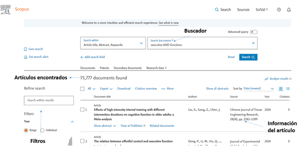 Para buscar la información que necesitamos es importante hacerlo en bases de datos que sean reconocidas por la confiabilidad de sus artículos. Existen distintas bases de datos de acuerdo al área de conocimiento y una de las metabases más utilizadas es Scopus. En la Figura 2, se visualizan los elementos que se encuentran en Scopus.