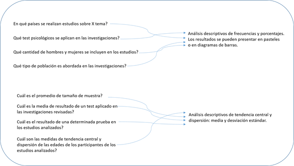 Las preguntas dependen del nivel de profundidad que el investigador desee llegar en el estudio. Por ejemplo, se pueden hacer preguntas de características sociodemográficas de las publicaciones, como, por ejemplo, tamaños de la muestra, género de los participantes, edad, país, continente, profesión u otra. Un siguiente nivel de pregunta podría ser en torno a las técnicas de medición y extracción de la información, como, por ejemplo, qué pruebas de ejecución se aplicaron, cuestionarios de medición utilizados, escalas de observación conductual y otras formas de medición.