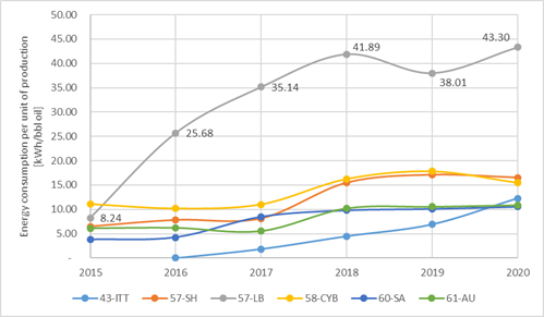 · Energy consumption per unity of production. This indicator shows the total energy consumption (mix of fossil fuels from: oil, diesel, gas, and imported electricity from SNI), per barrel of crude oil.