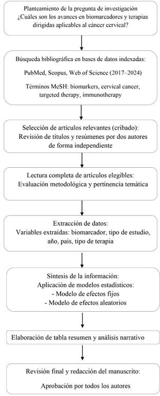 Se llevó a cabo una revisión sistemática de la literatura, utilizando la metodología PRISMA sobre avances en biomarcadores y terapias dirigidas para el cáncer cervical, mediante la búsqueda de artículos en las bases de datos WOS, Scopus, PubMed, ProQuest, Embase, Redalyc, Ovid, Medline, DynaMed y ClinicalKey, durante el periodo 2017-2025. Se tuvieron en cuenta como criterios de inclusión referencias en texto completo y textos en inglés y español. Se hizo la búsqueda con descriptores en ciencias de la salud (DeCS) de Bireme y los Medical Subject Headings (MesH) de la National Library of Medicine en inglés (Figura 1).