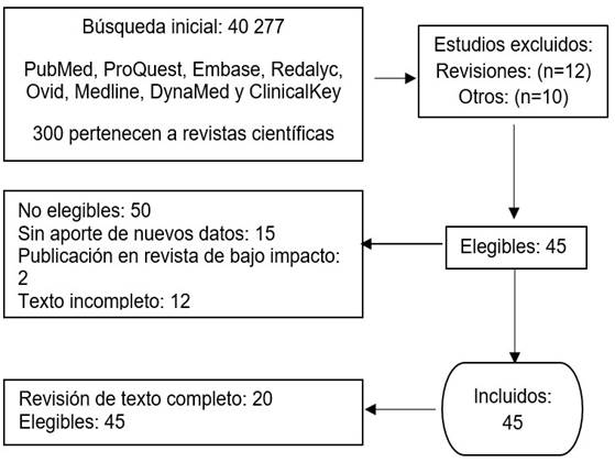 El total de artículos en la búsqueda inicial fue de 31 431; de los cuales, 300 pertenecían a revistas científicas. El total de artículos a texto completo examinados en la determinación de su elegibilidad fue de 95. El total de artículos excluidos fue de 50, por no tener relación evidente con los criterios de inclusión, mientras que el número total de estudios incluidos en la revisión sistemática fue de 45 publicaciones.