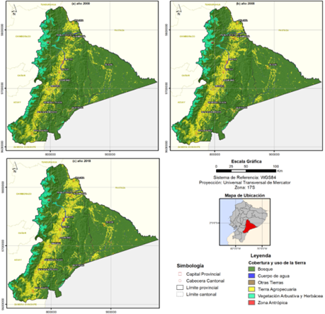 Desde el Geoportal oficial del MAATE, se descargan las capas de información geográfica (.shp) de cobertura y uso de la tierra a escala nacional para los años de análisis: 2000, 2008 y 2018. Estas capas con sistema de referencia WGS84 y proyección UTM 17S, se transforman en formato ráster (.tiff) con un tamaño de pixel de 30 metros, correspondiente a la escala 1:100 000, con la cual se genera originalmente esta información. Luego en función de la capa geográfica de límites oficiales del CONALI, se extrae la información de cobertura y uso de la tierra para la provincia de Morona Santiago.