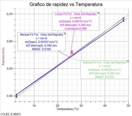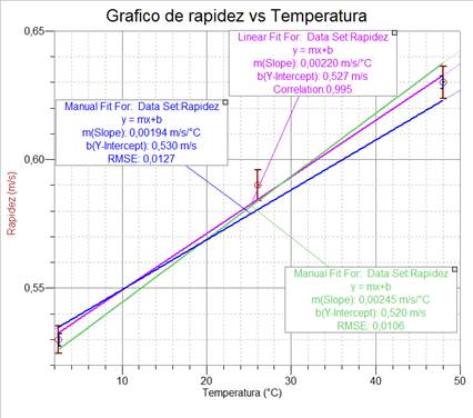 La Figura 1 ilustra la relación entre la velocidad tangencial promedio y la temperatura del agua en un remolino forzado con un radio de 50 mm. Los puntos reflejan los valores promedios obtenidos en los ensayos, mientras que la línea violeta muestra la pendiente ajustada (2,2 × 10⁻³), con la pendiente máxima de 2,45 × 10⁻³ representada por las líneas verdes y la mínima de 1,94 × 10⁻³ en la línea azul.